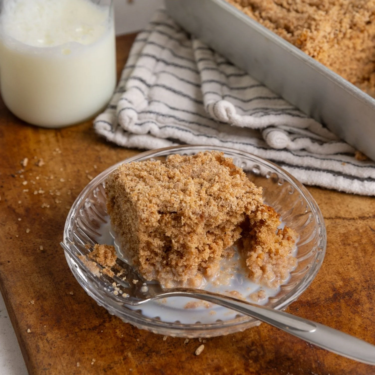 Fresh from the oven, scoop a warm slice into a bowl and pour over some cold milk. It’s like cake meets comfort food.